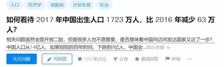 圖片來源于網絡 知乎上,有這樣一個帖子“如何看待2017年中國出生人口1723萬人,比2016年減少63萬人?”該帖子共有1100多條回復,其中網友表...