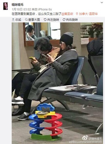 圖片來源:網友“喵咪喵毛”微博 1月18日,有溫哥華網友“喵咪喵毛”曬出自己拍到的黃圣依在醫院等待做二胎產檢的照片。照片中,...