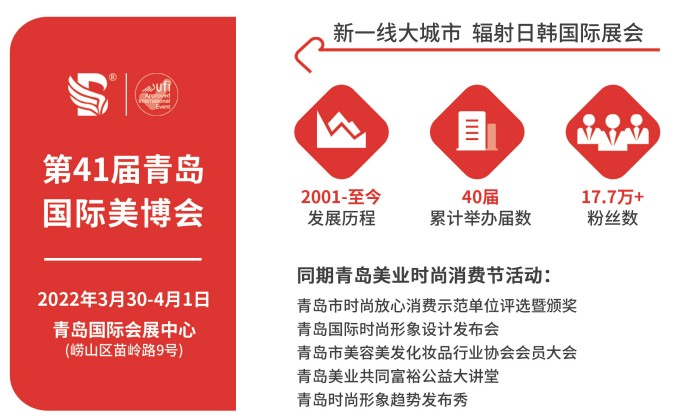 2022第41屆青島國際美博會 時間:2022年3月30日-4月1日 地點:青島國際會展中心(苗嶺路9號) 布展時間: 布展時間:3月28-29日 8:30-17:30...