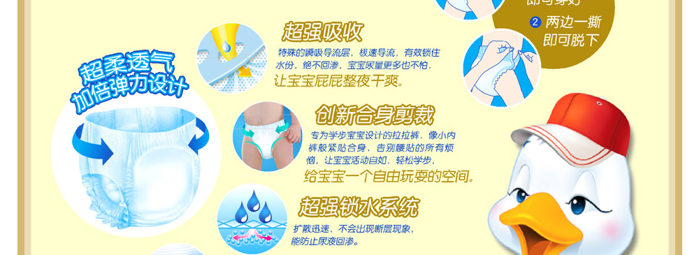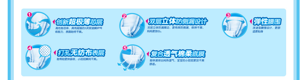 ·創新超級薄芯層:高性能芯體,具有超強的5次尿液瞬間吸收能力,表面始