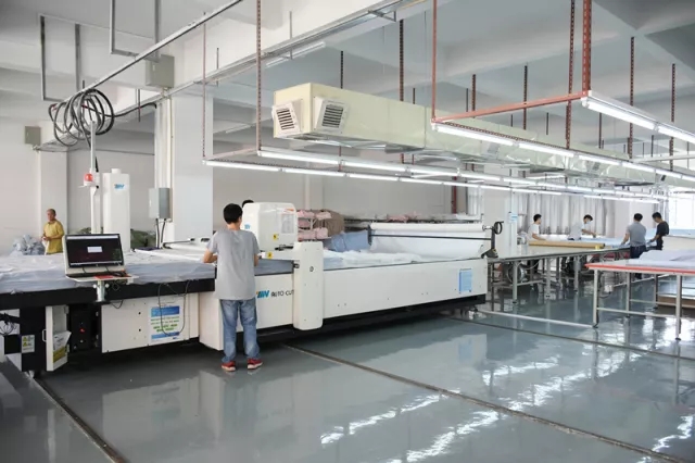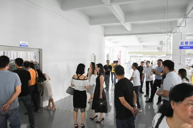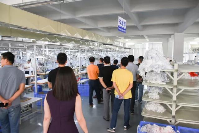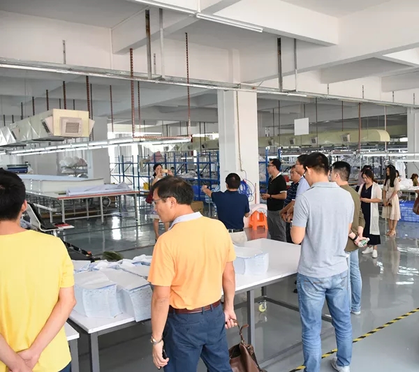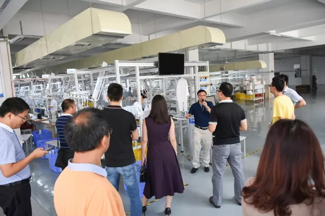 卓兒對面料、包裝、輔料的熒光劑都進行嚴格把控 生產線 最后,領導們參觀了智能生產線,并對現場先進的設備大嘉贊賞。 電腦裁床