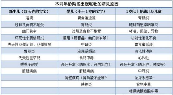 在寶寶發育的不同階段,導致嘔吐的常見原因也不同。具體可參考下表:
