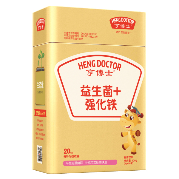 亨博士益生菌+強化鐵:拉曼進口益生菌粉,復配強化鐵,每100g產品中含鐵元素20mg,對缺鐵性寶寶有著顯著的補充效果,有效預防貧血,增強身體免疫力。
