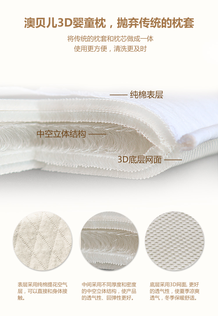 澳貝兒品牌系列產品選用來自德國工藝的3D立體高分子睡眠材料,開啟枕頭水洗新時代,3D立體高分子睡眠材料,可水洗,枕頭好洗快干,抗菌防螨,360度零死角,透氣性好,也稱為全水洗,會呼吸的枕頭。澳貝兒關注寶寶成長睡眠,伴隨千萬中國寶寶一起成長。