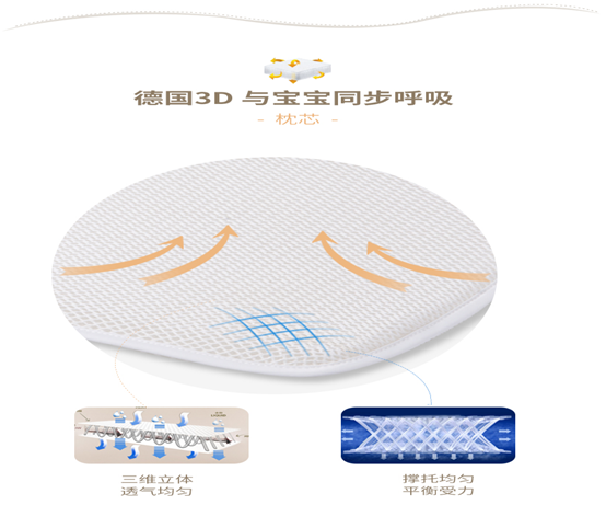 澳貝兒專為0-6歲寶寶設計睡眠系列產品,所有產品均采用3D立體中空材料作為產品的主要原材料,是嬰童枕全水洗的倡導者,讓寶寶徹底遠離螨蟲和病菌的傷害。并且根據每個階段寶寶生長發育對于枕頭的需求不同,度身定做。枕芯選用來自德國工藝的3D立體高分子睡眠材料,可全身水洗,并且容易晾干, 清洗360度無死角,枕頭抗菌防螨,透氣性好,也稱為全水洗,會呼吸的枕頭,是寶爸寶媽為寶寶選擇枕頭的首選。