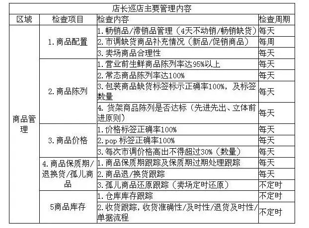 巡店并不只是在店里轉轉就行,它還需要對店內的各個板塊進行檢測和分析,具體巡店的主要管理內容可以參考下表: