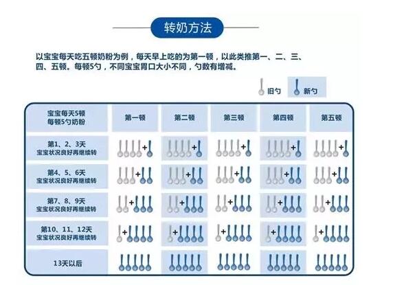 一般來說,寶寶轉奶大概需要2周的時間,寶寶的體質有所不同,轉奶的步驟也可因人而異,具體方法可參考以下兩種方式: