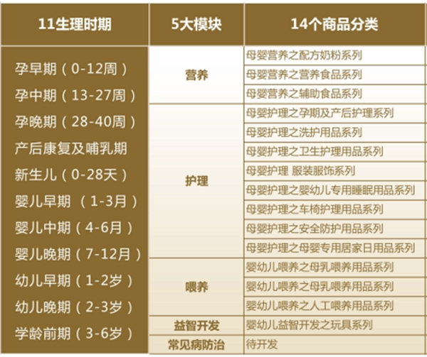 京正:王子羊品牌成立于2013年,發展到如今的規模,引起行業的廣泛關注,相信您在營銷模式上一定有秘笈,您認為王子羊的營銷模式有哪些創新之處呢? 楊會臣:王子羊品牌成立于2013年,但是我們做母嬰行業其實很長時間了,我愛人1998年就進入了母嬰行業,我們那時的門店名字不叫王子羊。2013年,我們成立了北京王子羊管理咨詢有限公司,正式啟用王子羊品牌,對所有的門店進行統一的終端形象、統一的安全商品、統一的優質服務的改造。 2013年以前,王子羊的門店是小賣部的概念,2013年之后王子羊從零售的維度來經營門店。在經營定位方面,我們從經營用戶的角度出發。經營用戶也就是經營消費者,與消費者產生互動,進而完成引流、信息留存、消費者復購、轉化、轉介紹等過程。具體來說,我們門店的商品搭配是按照11個生理周期和5大模塊來搭配的(見下圖),我們是一切從消費者出發,一切圍繞著消費者服務。