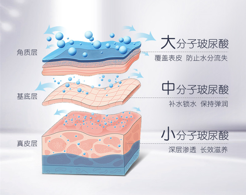 大分子透明質酸可以在皮膚表面形成一層透氣的薄膜,使皮膚光滑濕潤,同時可以阻隔外來細菌、灰塵、紫外線的侵入,保護皮膚免受侵害; 中分子透明質酸可以緊致肌膚,長久保濕; 小分子透明質酸能滲入真皮,能促進皮膚營養吸收,增加皮膚彈性。