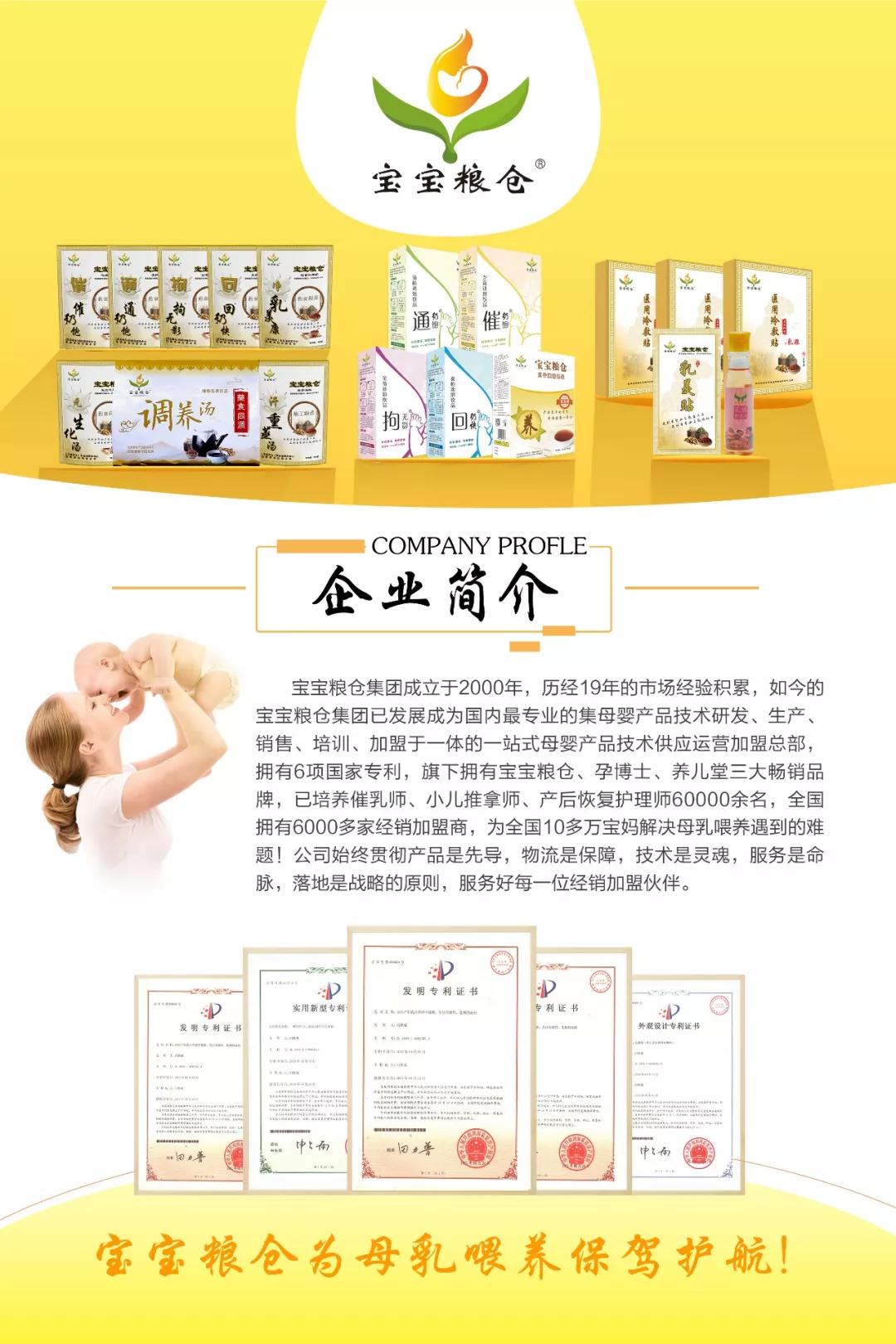 創辦于2000年的寶寶糧倉集團如今已經擁有6項國家專利,旗下擁有寶寶糧倉、孕博士、養兒堂三大暢銷品牌,已培養催乳師、小兒推拿師、產后恢復護理60000余名,全國擁有6000多家經銷加盟商,為全國10多萬寶媽解決母乳乳喂養遇到的難題。開創至今,寶寶糧倉一直秉承著以客戶至上的發展宗旨,用不斷積累的成熟行業經驗,幫助更多有志之士共創健康行業的輝煌。寶寶糧倉期待社會各界人士的加盟與合作,攜手關愛母嬰健康!