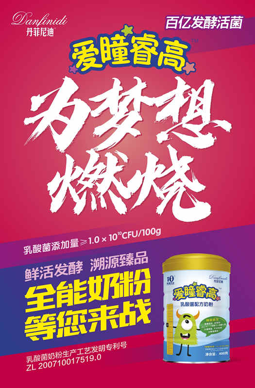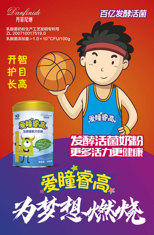 丹菲尼迪乳酸菌系列奶粉菌種屬于進口丹尼斯克乳酸菌菌種,是將高活性的乳酸菌經過本司獨家專利發酵工藝添加到無抗奶中制作而成,屬于調理并改善腸胃、補充身體有益菌的功能性(發酵型)產品。通過不斷的升級創新,研發出一系列的丹菲尼迪乳酸菌奶粉,其中丹菲尼迪愛瞳睿高乳酸菌配方奶粉在調理腸胃的基礎上針對性的添加了有助于骨骼生長、保護視力、益智護腦的成分,如水解蛋黃粉、初乳堿性蛋白、DHA、藍莓粉、葉黃素酯、核桃多肽、牛初乳粉等。水解蛋黃粉和初乳堿性蛋白可以增加成骨細胞數量并促進骨骼和牙齒的生成,激活骨骼自身的原動力、促進骨骼的伸長;促進骨骼的鈣質沉結,強化骨骼的韌性,抑制破骨細胞的生長,維持骨骼成分的平衡; DHA是神經系統細胞生長及維持的一種主要營養物質,是大腦和視網膜的重要構成成分,對智力和視力發育至關重要;而藍莓粉和葉黃素酯的添加可以增強視力,緩解眼睛疲勞、預防近視。