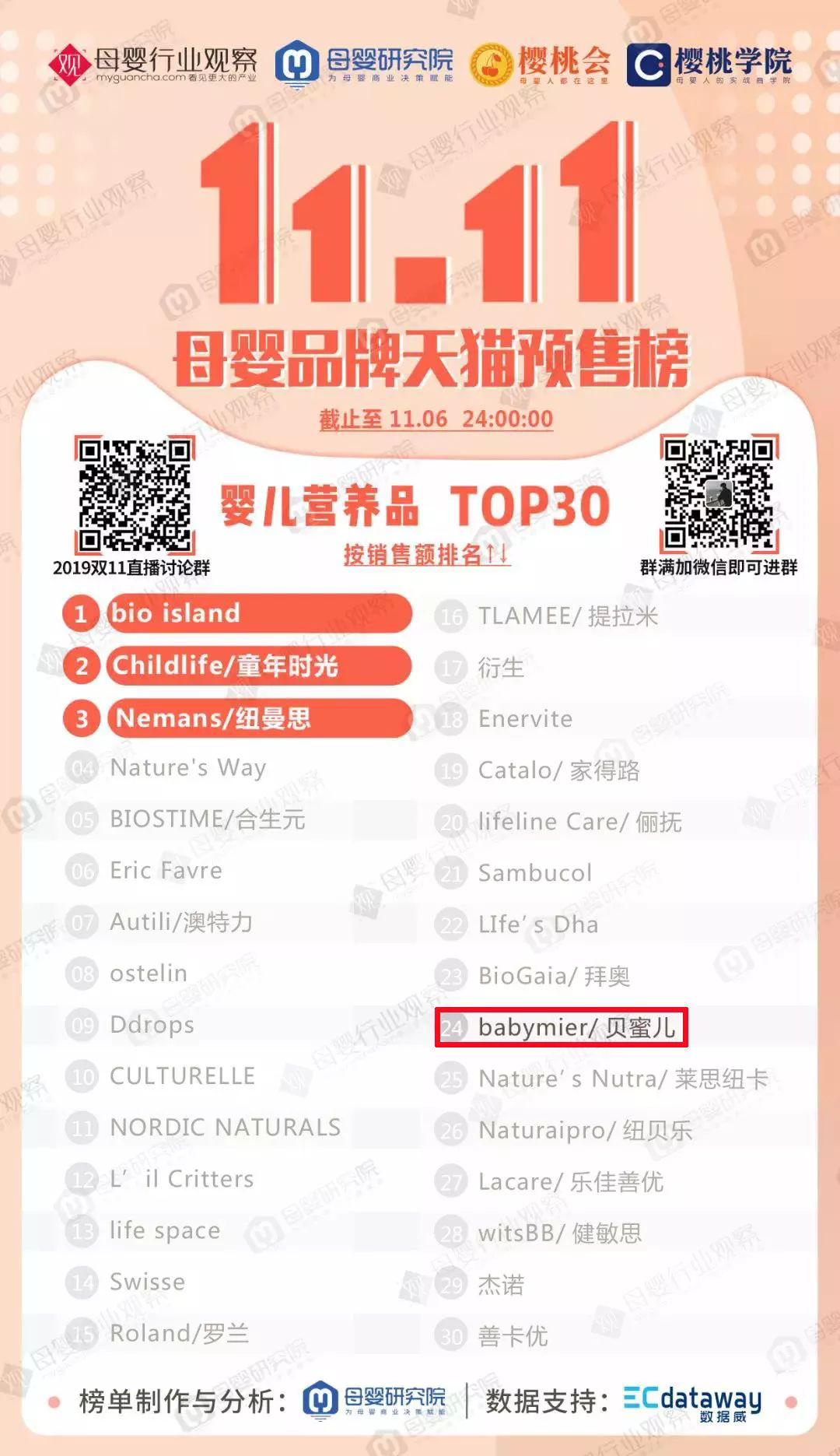 “雙11”天貓母嬰品牌預售榜,貝蜜兒榮登嬰幼兒營養品國產品牌第3名,全網TOP30,實現了貝蜜兒品牌價值的又一次飛躍,消費者對貝蜜兒品牌和品質的雙重肯定。