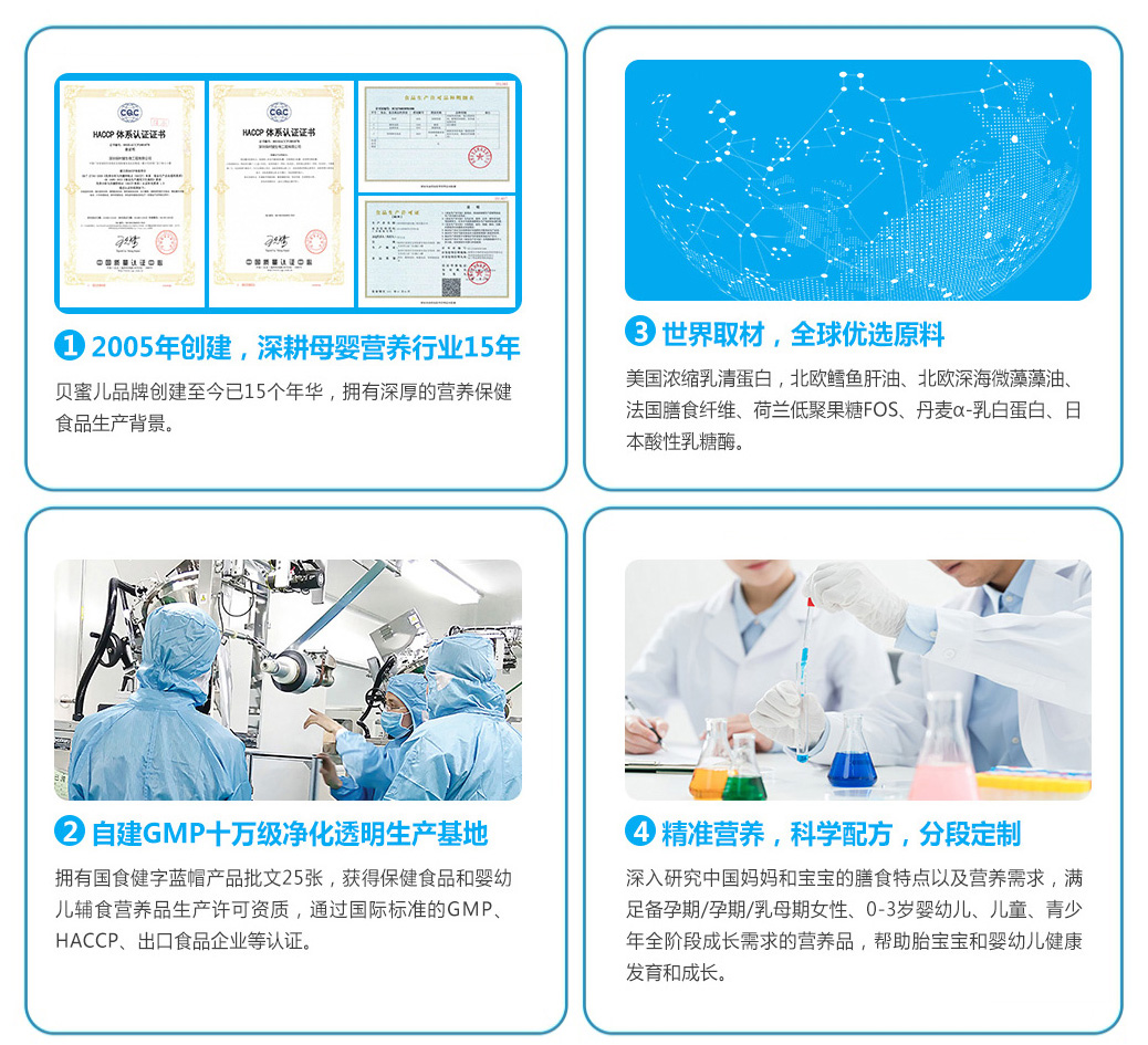 貝蜜兒順應母嬰行業時代趨勢,通過對產品品類升級作了突破性的創新。貝蜜兒系列產品兼具高質量、高含量、好營養的優勢,產品品類豐富,不單獨強調某一單項營養素的添加,而是重視營養均衡,原料優質,口感消化等方面,滿足不同消費人群的需求,深受萬千媽媽的喜愛。在產品品質上,不僅組成專業研發團隊,還在深圳龍崗高新產業園區斥資數千萬元建設了GMP十萬級數字化智能透明GMP工廠,從原料采集到產品加工再到包裝運輸,全產業鏈按照嚴格標準執行,確保產品營養與安全品質。