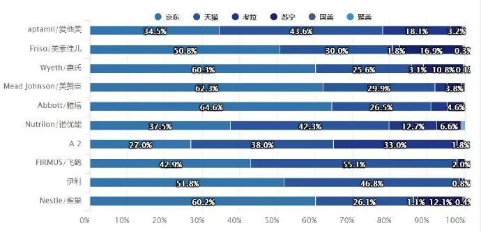 從2018年線上品牌top10就可以看出,前十中僅兩名是國產品牌,并且以飛鶴和伊利的全年業績都可以進入中國市場前五名,但線上數據卻不是很好,占有率遠遠低于其它外資品牌。 2、外資品牌的線上銷售額主要是:京東>天貓,國產品牌幾乎對半分