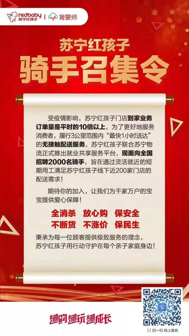 蘇寧紅孩子嘗試“共享就業” 無接觸配送助力訂單量“暴漲” 在疫情期率先啟動“員工共享”的盒馬,通過靈活就近的短期用工形式,有效緩解企業用人壓力,在各行各業掀起了一股熱潮。而“共享就業”擴展到了母嬰行業,蘇寧紅孩子就是第一梯隊嘗試“共享就業”的母嬰零售商。蘇寧紅孩子聯合蘇寧物流正式推出就業共享服務平臺,2月7日起面向全國招聘2000名騎手,通過線下近200家門店向消費者提供3公里范圍內“最快1小時達”的無接觸配送服務。 同時,確保“無接觸配送”萬無一失,蘇寧紅孩子采取了“配送雙保險”: 1. 為了確保騎手的健康狀況,蘇寧紅孩子會定時監測騎手的體溫,一律要求佩戴口罩。 2. 為保證交付安全,工作人員在配送過程中,會首先電話聯系用戶確認收貨的方式,將包裹放置指定位置,并通知用戶自行提取快遞,全程與客戶零接觸。
