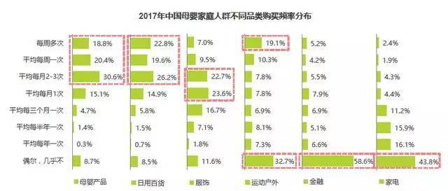 三、母嬰市場的消費特點 母嬰產品的消費頻次較高,每月購買多次的用戶占比近70% 母嬰家庭人群購買母嬰產品的頻次與日用百貨接近,近70%用戶每月會購買多次。與其他品類相比,母嬰家庭對母嬰產品的消費頻次較高。 其他品類中,1)服飾的購買頻率集中于每月1-3次;2)對運動戶外產品的購買呈現兩極分化趨勢,19.1%的用戶每周多次購買,32.7%的用戶偶爾購買;3)對金融和家電的購買頻率整體低于其他品類。