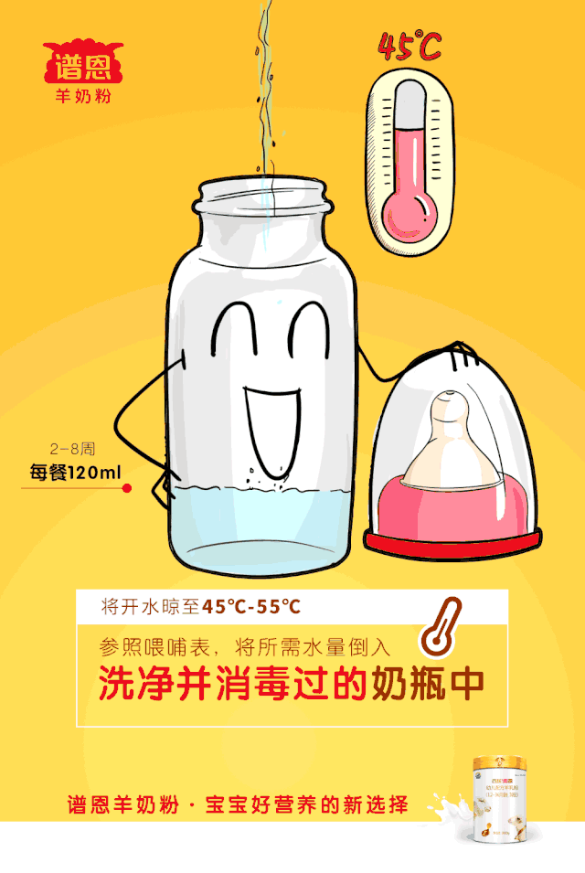 2、將開水晾至45℃-55℃,參照喂哺表,將所需水量倒入洗凈并消毒過的奶瓶中