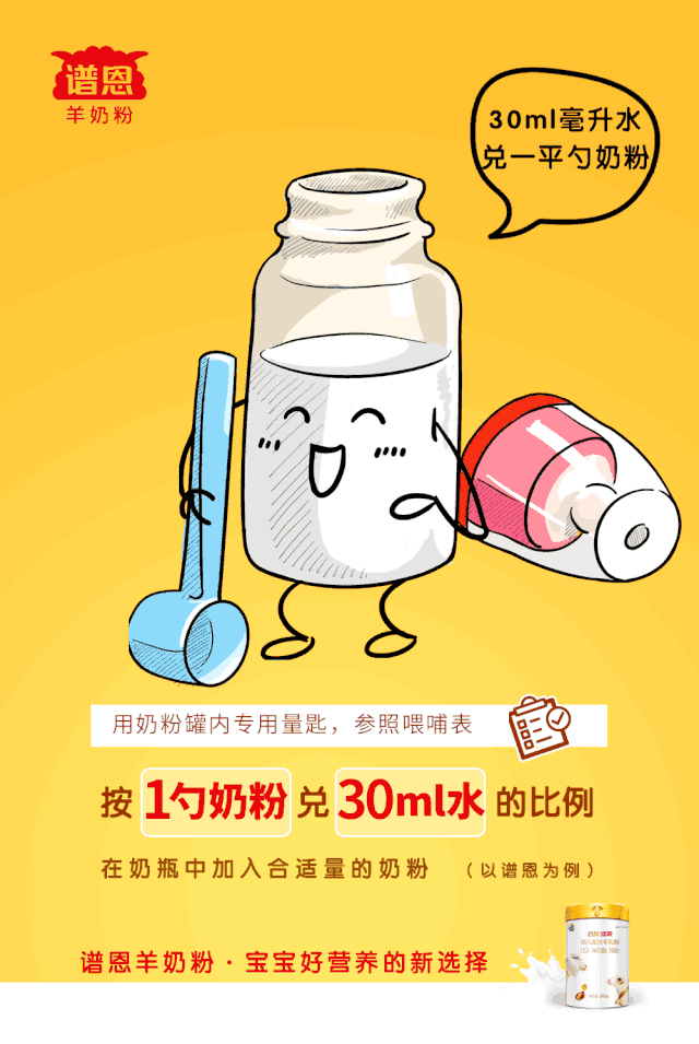 3、用奶粉罐內專用量匙,參照喂哺表按1勺奶粉兌30ml水的比例在奶瓶中加入合適量的奶粉
