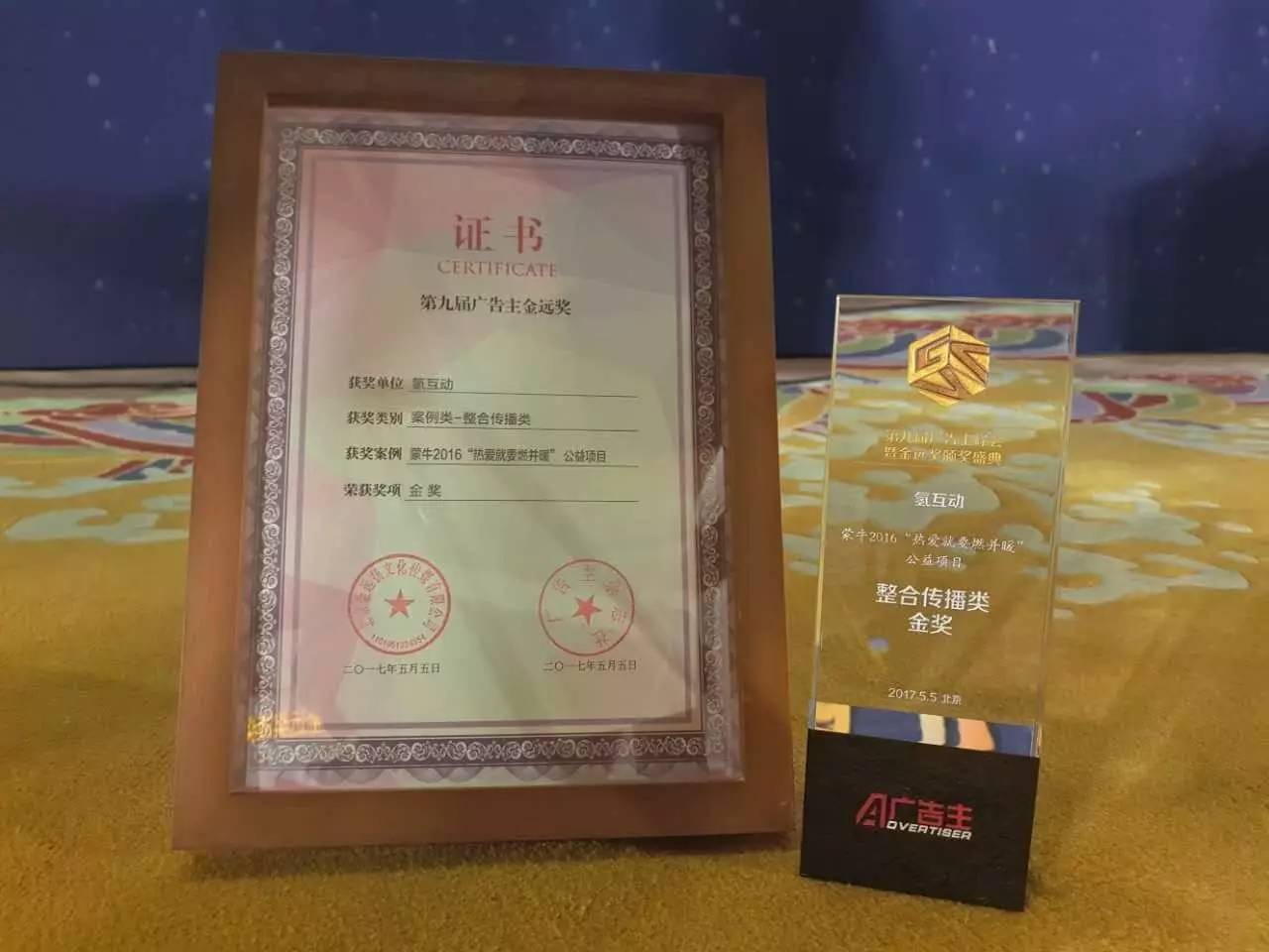 2017年5月5日,《跌變2017·第九屆中國廣告主峰會暨金遠獎頒獎盛典》在北京舉行。蒙牛阿憑借“熱愛就要燃并暖”項目獲得公益項目整合傳播類金獎。