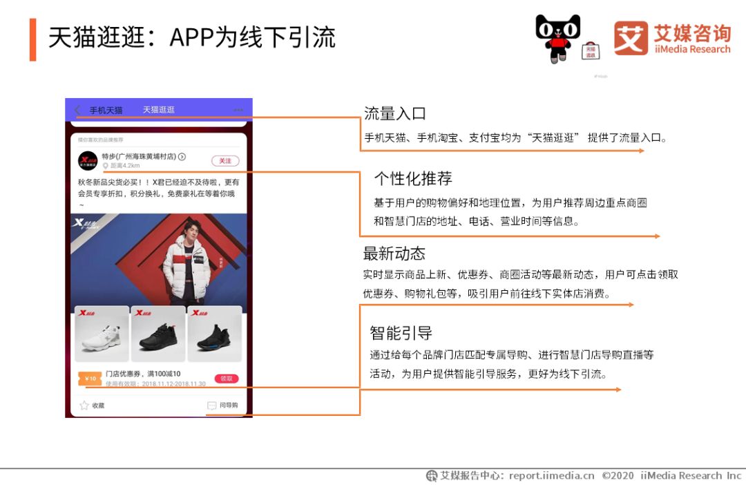 2018年雙十一期間,天貓新零售的重要布局——天貓逛逛正式落地北京、上海、廣州、深圳等12座城市,并且覆蓋100個重點商圈,20萬智慧門店和50萬智能導購,通過APP為線下引流的方式,使線上線下購物深度融合。