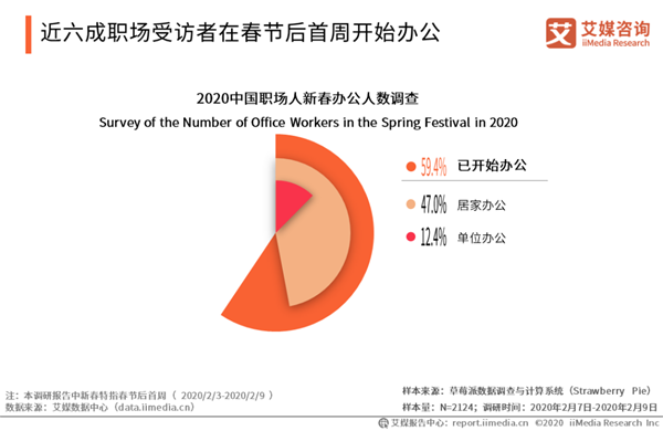 iiMedia Research(艾媒咨詢)數據顯示,盡管僅有26.3%的受訪職場者表示其所在企業于2月10日前復工,但在2月10日前開始辦公的受訪職場者占比達59.4%。艾媒咨詢分析師認為,多數企業在節假日期間也會安排少量人員處于在崗狀態,是造成以上兩個數據差異的主要原因。在開始辦公的受訪者中,采取居家辦公的占47.0%,回單位辦公的占12.4%。