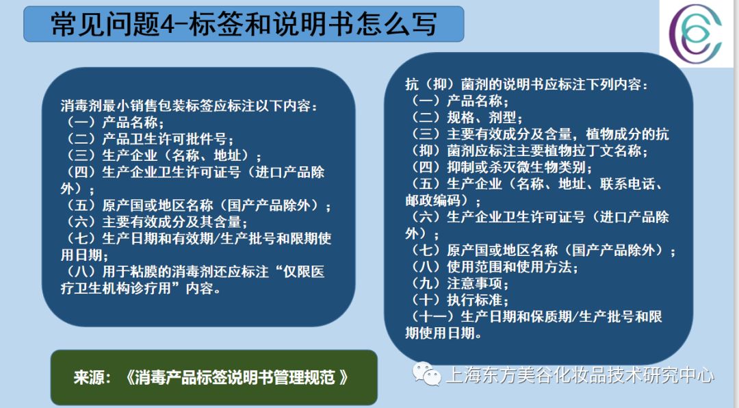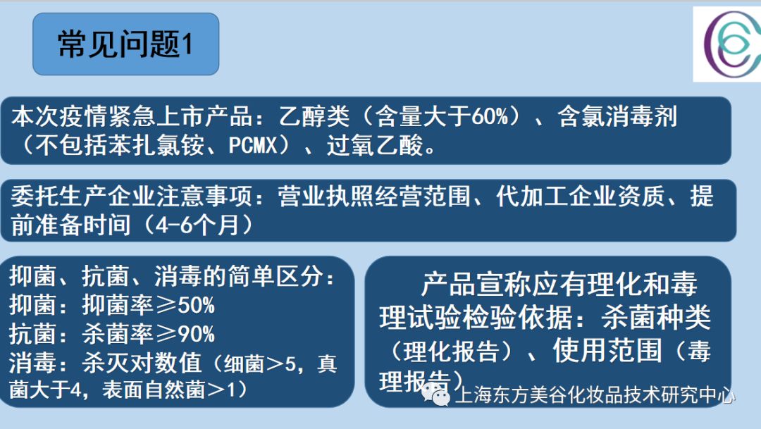 近期疫情高發,與協會咨詢新增消毒產品事宜的增多,為避免盲目上馬帶來資金浪費,2月10日上午邀請南京佳原堂湯總工、湖北維美日化鄒總二位中心專家分別就:消毒產品申報備案與設備工藝、市場前景進行了研討。并就常見問題回答了大家的提問,中心會員南六平湖潘工、黃山荷繡生物余總、上海納緹生物唐總等也發表了自己看法。上百家公司人員參與了這次專題互動。上海東方美谷化妝品技術研究中心將這次研討整理了下,供大家參閱。 一、申證