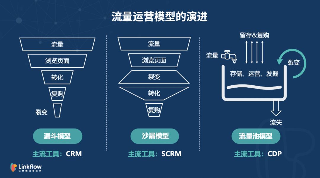 企業在流量運營的探索上從未止步,流量運營方式的演進主要以以下三種模型體現。