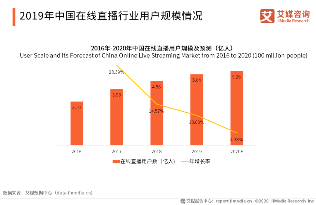 隨著技術的發展,在線直播迎來行業機遇,電商直播、“直播+”新商業模式在2019年迅速發展。用戶重視在線直播平臺的使用體驗、直播內容和主播等因素,看好5G、AI等技術應用助力在線直播進入發展新階段。未來,在線直播行業的商業價值將被進一步開發。 中國在線直播行業用戶規模穩步增長 中國在線直播行業用戶規模近五年來一直保持穩步增長,行業發展穩健。數據顯示,2019年中國在線直播行業用戶規模已增長至5.04億人,預計2020年在線直播行業用戶規模達5.26億人。 “直播+”模式持續發展,電商直播勢頭迅猛 2019年在線直播平臺陸續推出“直播+”節目,“直播+”模式發展迅速,其中“直播+電商”受關注程度最高,超過40%的受訪用戶表示觀看過此類節目;淘寶、快手等平臺也相應推出了許多電商直播活動。未來“直播+”的商業模式將繼續發展,在線直播行業的商業價值將進一步被開發。 在線直播賽道競爭加劇,技術賦能助力行業發展 2019年,熊貓直播關閉,快手抖音等短視頻平臺加強直播業務,B站直播發展迅速,在線直播行業競爭更加激烈。而技術的革新,如5G的到來,為在線直播行業的發展帶來巨大的機遇。在線直播平臺應順應發展趨勢,加強技術布局,創造更多優質內容,贏得競爭優勢。 2019年中國在線直播行業用戶規模情況 iiMedia Research(艾媒咨詢)數據顯示,2019年中國在線直播行業用戶規模達5.04億人,增長率為10.6%;2020年用戶規模預計達5.26億人。艾媒咨詢分析師認為,中國在線直播行業將繼續保持穩健發展,未來行業將進入精細化、專業化運營階段。