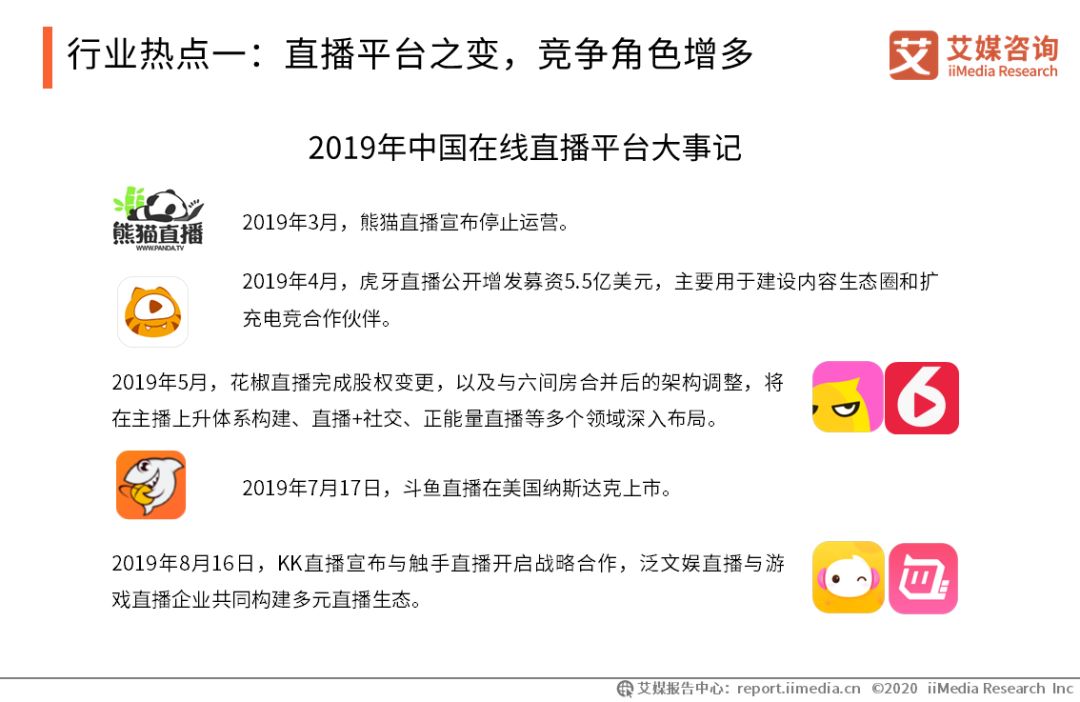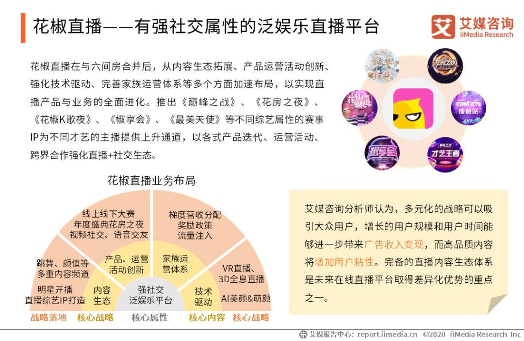 花椒、斗魚的“直播+綜藝”節目知名度高 iiMedia Research(艾媒咨詢)數據顯示, 2019年花椒直播、斗魚直播在“直播+綜藝”領域中表現亮眼,平臺的“直播+綜藝”節目知名度較高。艾媒咨詢分析師認為,大部分直播用戶出于娛樂需求觀看直播節目, 而“直播+綜藝”節目娛樂性強,直播平臺可以此豐富平臺自身內容生態,持續優質內容輸出,在“直播+”模式中取得競爭優勢。
