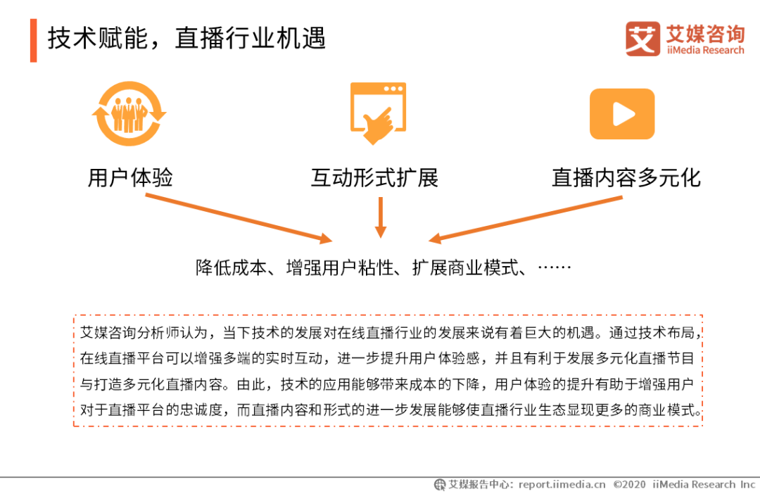 中國在線直播行業發展趨勢預測 “直播+”商業模式創新,探索商業價值 未來“直播+”趨勢將進一步發展,在線直播向細分領域拓展,例如垂直市場中的電商、教育等,內容垂直化更加明顯。在線直播內容與形式多樣化發展,滿足用戶的多元化需求,商業模式繼續創新,在線直播的商業價值將進一步開發。 直播“出圈”,在線直播關注度提升 直播更加“出圈”,在線直播更加日常化、生活化。由于技術的成熟,媒體信息將更加強調動態、實時,在線直播在媒體上的滲透率將增加,互聯網用戶的參與度以及直播的關注度將進一步提升。 在線直播專業化運營,主播生態建設更加完備 在線直播行業將更加注重精細化與專業化運營,產業鏈布局更加齊全完善。平臺通過產品與形式的創新立足自身的差異化特點,避免陷入內容同質化,并通過加強主播生態的構建等舉措,強化平臺優勢,在激烈的競爭格局中贏取用戶。 在線直播市場下沉發展 用戶下沉是近年來互聯網發展的關鍵點之一,對于三四線城市的用戶,娛樂方式較少,而空閑的娛樂時間較為豐富,加強對該部分用戶的挖掘,可以為在線直播開辟市場空間。在線直播市場下沉發展,也將推進在線直播在內容與形式上的創新。 電商直播勢頭強勁,在線直播助力賣貨 傳統電商流量紅利風口已過,而在線直播的實時性、互動性極大地增強了用戶體驗,降低了用戶在電商購物中的不確定性,增強了用戶消費沖動,提升了轉化率。未來電商直播將繼續發展,主播應注意利用自身的口碑及社交關系,形成用戶沉淀,從而在電商直播中脫穎而出。 技術賦能,實時交互等性能加速發展 在線直播平臺將繼續借助技術為其賦能,通過布局5G、VR、AI等技術獲取差異化優勢并尋求平臺留存用戶、提高收益的突破點。多元化實時交互功能加速發展,在線直播平臺通過技術實現布局更多業務的可能。 以上內容節選自艾媒研究院發布的《2019-2020年中國在線直播行業研究報告》