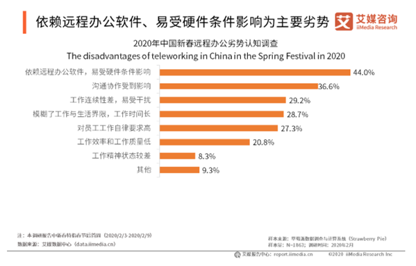 確實,借助互聯網進行線上辦公,受工作地點影響小,辦公安排較為靈活;而在家辦公還節省了通勤時間與交通費用,方便快捷。 然而有意思的是,在各類社交媒體中,關于遠程辦公的討論,更多是吐槽的聲音。在家容易被打擾、網速不穩定、溝通不順暢等問題,匯聚成了一句:好想上班,回公司的那種! 調查結果也顯示,超四成的受訪用戶表示,遠程辦公存在依賴軟件,易受硬件條件影響的問題;近四成受訪用戶認為,遠程辦公溝通協作受到影響。不過,在多日的磨合下,已有超過五成的受訪用戶表示適應遠程辦公模式。