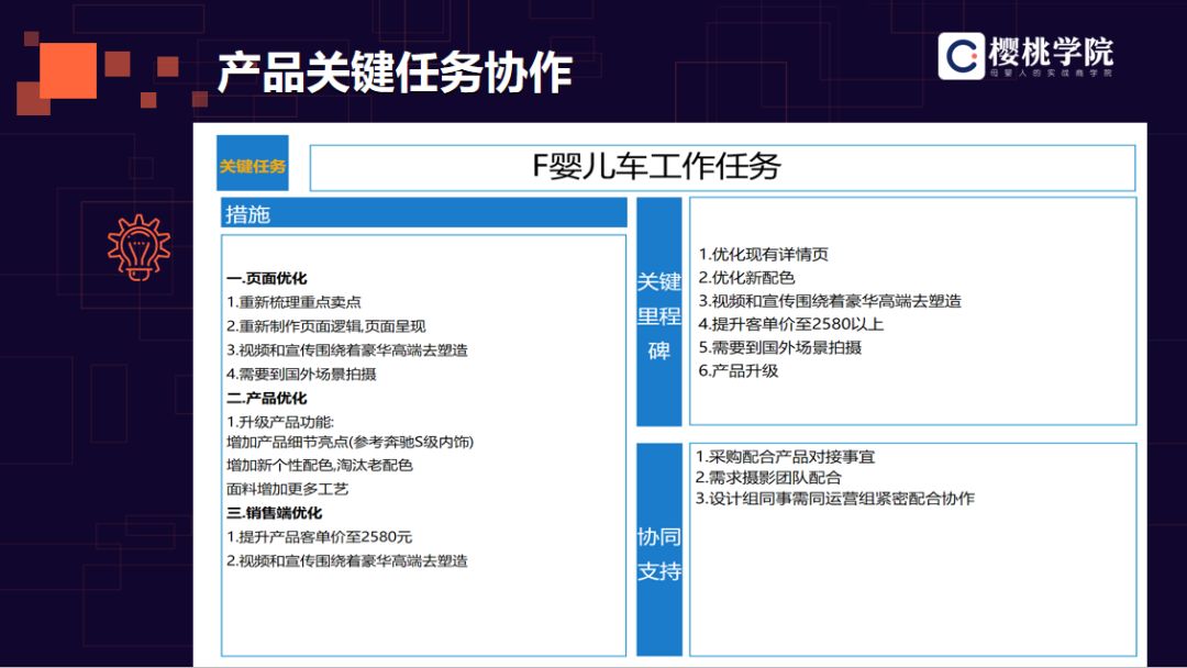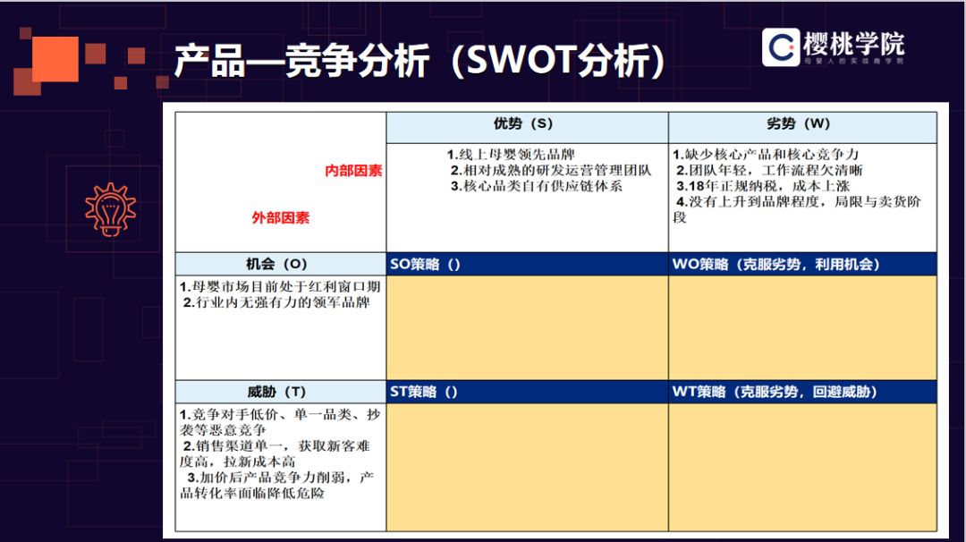 滲透力包括紙尿褲、嬰幼兒牛奶粉、睡袋、洗護用品等; 復購力包括嬰幼兒牛奶粉、嬰童褲子、套裝、運動鞋等; 價格力包括紙尿褲、濕巾、手推車等,很多品牌是依靠產品顏值提升價格力的。紙尿褲是一個廝殺比較厲害的品類,但是在2019年依然有品牌脫穎而出,例如babycare,它整體的顏值是比較高的,從而拉升了價格力,可以對比一下它的價格和店鋪,憑借顏值增加了產品的溢價能力; 延展力包括嬰童板鞋、孕婦褲中的直筒褲、孕產修復儀中的產后塑形等儀器,以及孕婦裝里的孕產婦鈴鐺。另外舉一下之前在可優比做過的一個品類作為例證,就是防摔枕。防止寶寶學步時仰摔到頭部,這一產品解決了用戶的痛點,用戶自然會買單,這也是延展出來的一個產品。 1、根據GROW模型,打法沉淀 一是通過CRM,增加與該類人群的互動,持續召回老客,加強復購,老帶新裂變。購買頻次為核心驅動因子;利用其高頻購買忠誠度一特性,增強該策略人群與品牌的粘性。 二是廣泛吸引AI人群,站外種草,活動前預熱,促進該類人群對品牌首單購買。購買人數為核心驅動因子;利用其人群增量,提高品類在該人群中的滲透能力。 三是品類核心人群,通過單品類輻射到品牌其他品類,先做單品類的爆破和擊穿,然后再延伸到其他品類,提高客單的連帶率。 四是新品發售&單品組套發售目標人群,促進高客單轉化。核心驅動因子為頻次和客單價;利用新品吸引購買或者利用套裝增加策略人群的高客單購買。 2、GROW產品模型 如何落地 首先是戰略規劃能力。我們發現,遇到戰略轉型,很多時候企業會選擇全做或全不做,很少進行針對性的側重和選擇。前者會導致企業的戰略資源被攤薄,執行達不到效果;后者則會讓企業陷入溫水煮青蛙的境地。戰略其實就是做權衡,而 GROW 模型的目的正是協助企業更明智地做選擇。 其次是提升組織能力,包括商品開發、數字化營銷、大數據分析等 ,特別需要建立統一的數據中臺,整合各領域數據,包括消費者分群信息、消費者線上及線下的購物車信息、消費者瀏覽行為信息、按品類的銷售信息、按促銷的銷售及利潤信息等。這樣才能為后端的品類開發和前端營銷部門提供明確的方向指導。 最后要改變傳統的工作方式,推行敏捷工作方法和鼓勵試錯的創新文化。敏捷不僅僅指速度效率的提升,更是真正以客戶為中心,快速滿足客戶的需求和反饋;打破部門墻,加強團隊協作;提升員工權限和主人翁意識。與數字原生企業相比,傳統消費品企業的文化厭惡風險,崇尚效率。然而互聯網平臺讓企業創新的成本大大降低,企業不妨將線上作為“嘗新”的測試平臺,鼓勵快速創新、快速失敗,并根據關鍵數據指標進行快速迭代試錯,最終打造出爆款產品。 更加嚴謹的做產品—競爭分析,就是SWOT分析,找到我們的優勢和劣勢,我們的機會和威脅都有哪些,內部和外部因素都有哪些。