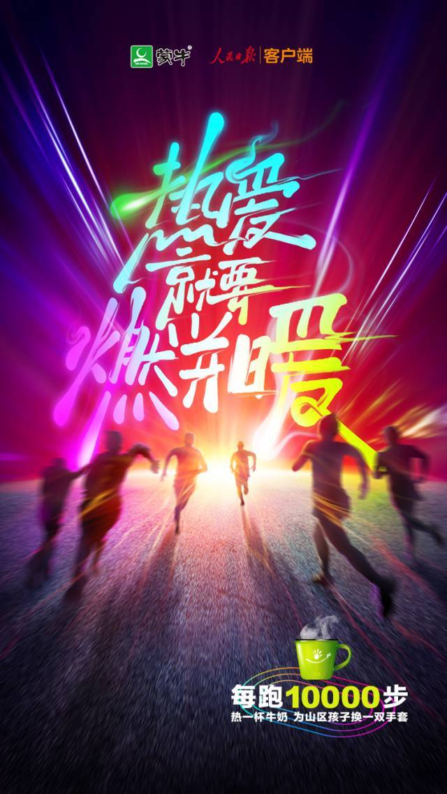 2016年11月24日感恩節,由蒙牛聯合人民日報客戶端發起“熱愛就要燃并暖”公益活動暖心開跑。13座城市13所大學校園,開啟冬日最暖愛心接力。通過跑步積累10000步,兌換一杯熱牛奶,同時還能為山區小朋友捐贈一雙手套。