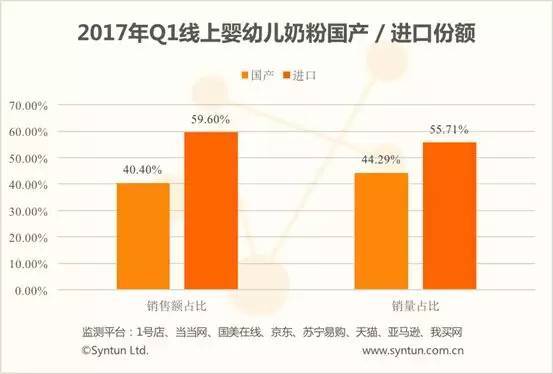 盡管線上嬰幼兒奶粉市場整體利好,但是國產品牌依然不容樂觀,進口對于國內奶粉制造業的沖擊很大,從數據來看,1季度國產銷售份額有進一步縮小的趨勢。國產奶粉僅保住線上奶粉市場4成份額,占比為40.4%,這個數字較16年同期也是有所下降的。不僅線上如此,線下情況也類似,據尼爾森17年1月數據顯示,在全國商超和母嬰渠道中,本土品牌的市場份額只有34.4%,而作為國產奶粉核心渠道的母嬰渠道中進口品牌也占到5成以上。