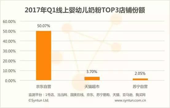 下圖為星圖數據監測到的線上奶粉市場銷售額排名前三位的店鋪,京東自營銷售以50.07%的占比遙遙領先,天貓超市也僅有3.70%,京東自營的能力可見一斑。16年京東與天貓的市場份額差距還未如此懸殊,雖然京東在嬰幼兒奶粉領域一直領先,但天貓也是步步緊逼,京東的份額也一直在5成左右徘徊。京東自營的成功一方面受行業變化的影響,另一方面我們也能看到京東去年下半年以來在營銷、數據及物流等領域的發力。在嚴峻的形勢下,本土奶粉品牌不能再抱殘守缺,國家及政策等的扶持不能演變成一場奶粉企業的“捧殺”,除了產品、營銷等方面尋求突破外,要努力發展多渠道策略,提升自身的競爭力。