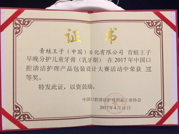| 青蛙王子早晚分護兒童牙膏榮獲中國口腔清潔護理產品包裝設計大賽三等獎 |