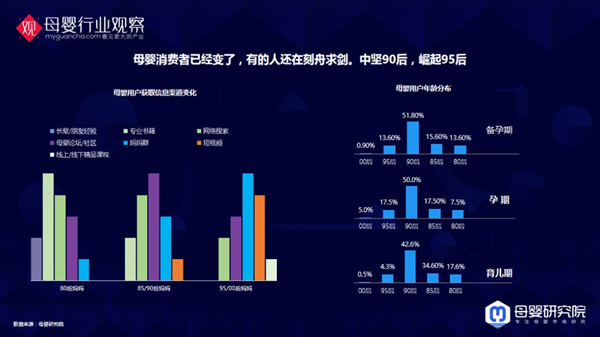 80后、85后、90后、95后、00后媽媽信息獲取渠道已經發生了很大的變化,95/00后媽媽,短視頻和微信群是她們獲得信息的第一第二途徑,80后是完全不一樣的,她們還去搜索,看專業書籍。同時我們看到在備孕期、孕期和育兒期,90后和95后已經是絕對的中堅主力。