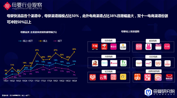 母嬰快消品各個渠道中,母嬰渠道規模占比50%,電商渠道占比38%且增幅最大,雙十一電商渠道份額可沖到50%以上。線上的份額還在增長,尤其是一些標品化的產品。