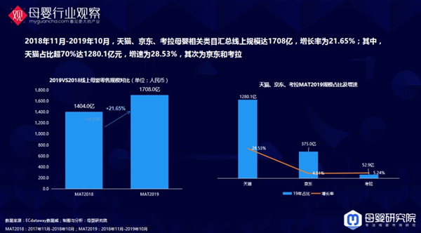 我們統計了天貓、京東、考拉等一些線上的主流平臺母嬰相關類目數據,總規模達1708億,增長率約為21%,其中天貓占比最大,超過70%。