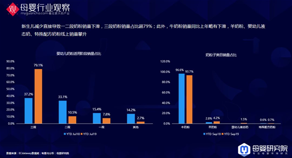 新生兒減少直接導致一二段奶粉銷量下滑,三段奶粉銷量占比超79%,另外很多企業都推出了四段奶粉,所以2020可能三四段奶粉是他們的主打產品;此外,牛奶粉銷量同比上年略有下滑,羊奶粉、嬰幼兒液態奶、特殊配方奶粉線上銷量攀升,增長還是很明顯的。