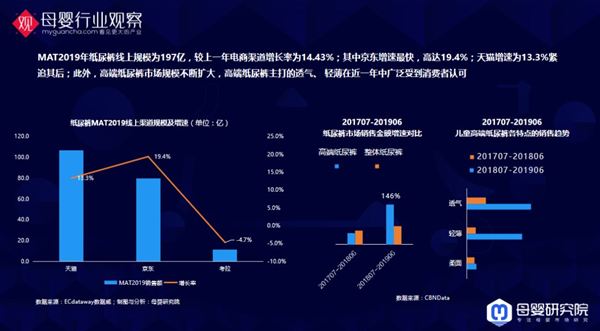 我們知道有很多家紙尿褲企業其實已經倒閉了,還是體量比較大的,2019年開始為前些年的冒進、泡沫買單。2019年紙尿褲線上規模為197億,較上一年電商渠道增長率為14.43%;其中京東增速最快,高達19.4%;天貓增速為13.3%緊追其后。