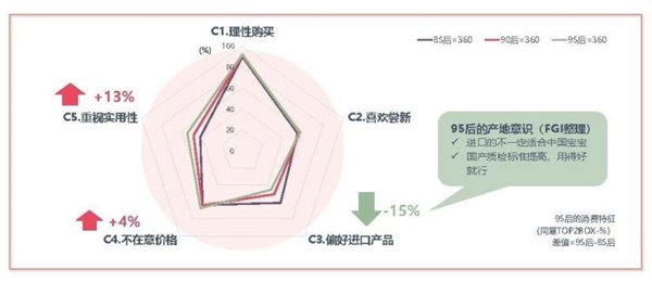在國貨品質的喜愛和信賴感上,95后新生代媽媽的認同感日益加深。在相對富裕的環境中成長起來的95后年輕一代“不差錢”但更理性。信息化社會為商品傳播提供便利的同時也讓媽媽可以接觸到更多專業的知識。學習型媽媽當道,他們更懂得怎么給孩子挑選更好的。因此,相比其他年齡段的媽媽,95后更注重實用性、不在意價格、對進口產品偏好度較低。95后的產地意識表現為“進口的不一定適合中國寶寶”、“國產質檢標準提高,用得好就行”。