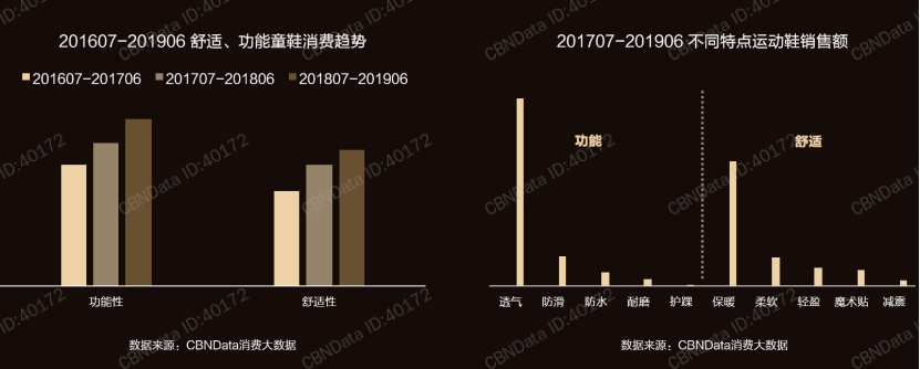 CBNData消費大數據也顯示:從2016年7月到2019年6月,消費者對功能性童鞋的需求越來越高,在功能屬性中更加關注透氣性和保暖性。