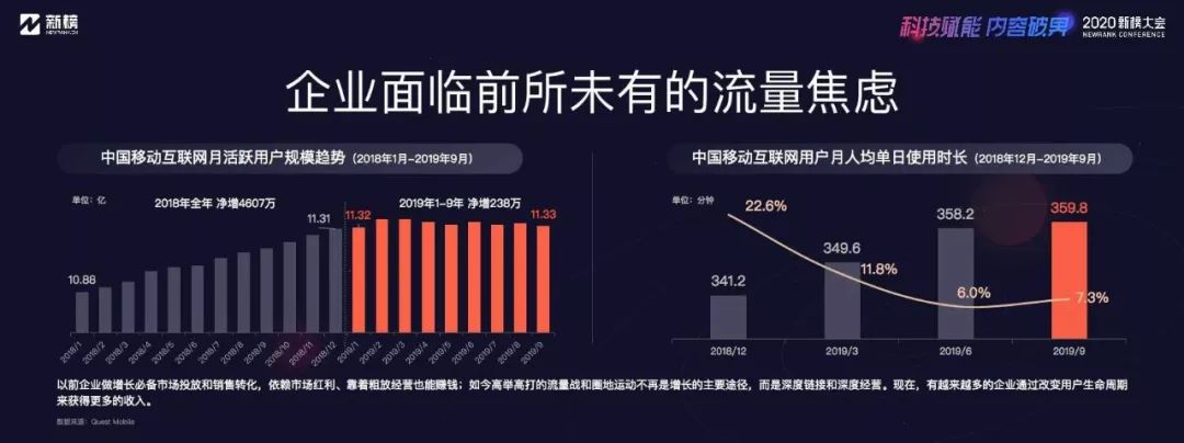 企業提出這些問題,是因為正面臨前所未有的流量焦慮。剛做完跨年演講的羅振宇老師曾提出“國民總時間”的概念,網民的上網總時間取決于兩個因素,一是網民規模,二是人均上網時長。根據第三方數據,中國移動互聯網的MAU,也就是月活躍用戶,2018年年初為10.88億,年底增長到11.31億,全年凈增4000多萬;而截至到2019年9月底的月活為11.33億,9個月只增長了200多萬。月人均單日使用時長,從2018年12月份的341分鐘增長到2019年9月份的359分鐘,但同比增長從22.6%下滑到7.3%。所以我們說,網民的上網總時間還在增長,但增速卻在大幅放緩。
