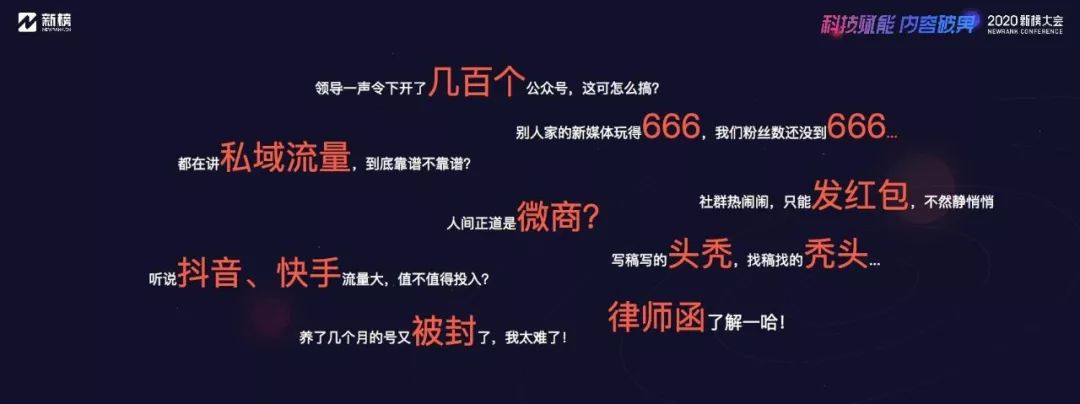 去年新榜大會,我們提出了兩個概念,全域營銷和私域運營。過去的一年里,圍繞這兩個方向,我們做了很多嘗試,昨天維宇講了全域營銷,今天我主要就私域跟大家做個交流。 私域火了一整年,有人借助私域賺得盆滿缽滿,甚至誕生了上市公司;也有人投入巨大卻空手而歸,年終總結核心只有四個字:重在參與。 我們經常被問到各種各樣的問題:集團幾百個號,怎么運營和管理?別人玩得666,我們粉絲數還不到666;私域流量就是微商嗎?社群就是發紅包嗎?抖音、快手要不要做?內容生產能力不足怎么辦?版權怎么解決?