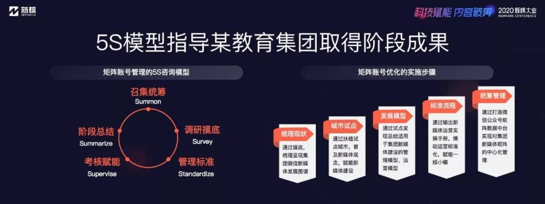 在這里,首先感謝不愿意透露姓名的客戶對我們的信任,在整整一年的時間里,和我們共度了一段不知終點的探索之旅。在新榜提出的5S原則指導下,我們協助某大型教育集團對新媒體矩陣進行了優化提升,并取得了階段性成果。大致分為5個步驟,第1步通過調研摸底,梳理出集團的新媒體發展圖譜;第2步在重點城市和學校進行試點;第3步通過試點總結出管理和運營兩個模型;第4步形成SOP手冊;第5步打造開發了數據中臺系統。