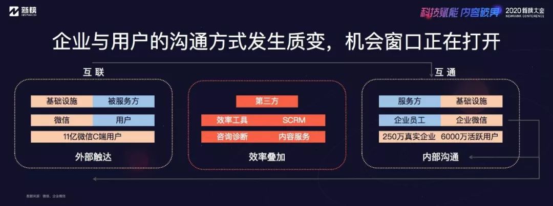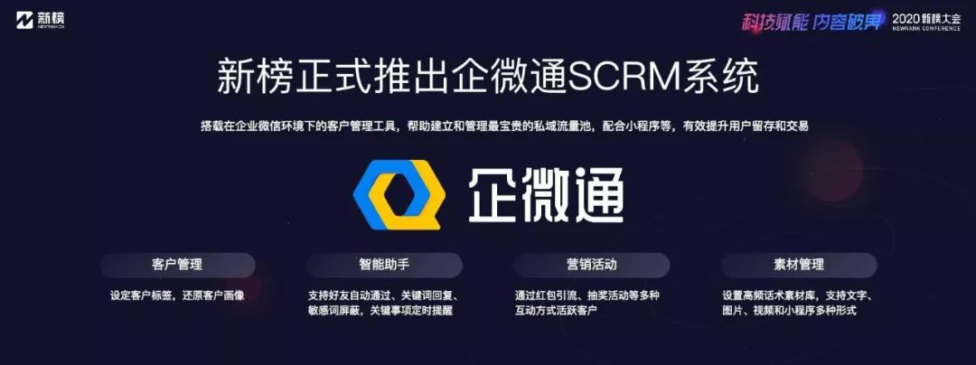 私域流量這一概念讓無數企業看到發展的新機遇,但同時很多人對概念的理解也容易走向偏狹,比如只把流量當流量,忘記背后是真實有生命的用戶。當下眾多私域玩法還在“野蠻生長”,企業需要一套系統性的認知與打法。在本篇文章中您將看到: 1、企業當下的流量焦慮以及新的傳播紅利; 2、流量的本質以及私域的價值所在; 3、經營好私域流量的三個關鍵點; 4、新榜能為企業私域運營提供什么? 1月7日,新榜聯合創始人李建偉在2020新榜大會發表了題為《我拿你當私域流量,也拿你當朋友》的演講,并推出搭載在企業微信環境之下的企微通SCRM產品,配合小程序,幫助企業建立和管理私域流量池,有效提升用戶留存和轉化。 以下內容整理自現場演講,經由嘉賓本人確認: