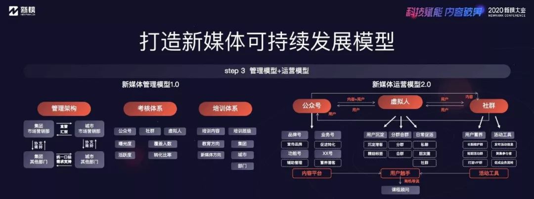 通過梳理,我們發現集團已納入體系管理的公眾號共有443個,分布在全國68個城市。我們面向運營這些公眾號的一線小編發放并最終收回303份問卷,并做了11次電話深訪,其中8次面向集團內部,3次面向行業標桿。試點學校的提升也非常明顯,在微信流量相對下滑的前提下,粉絲數實現逆勢增長,不管絕對數還是比例都好于2018年。 根據客戶矩陣運營的實際情況,我們總結出兩個模型。首先是管理模型,界定了集團與城市、市場與業務兩兩之間的關系和聯動,制定了公眾號、社群、虛擬人的量化考核機制,以及面向集團、城市、部門三個層級的培訓體系,培訓的內容又包括教育和新媒體兩大方向。然后是運營模型,主要界定了公眾號、虛擬人、社群各自的功能定位和兩兩之間的關系聯動,以公眾號為內容平臺并進行分類,以社群為活動工具積累潛在用戶,將虛擬人作為運營的核心和用戶觸手,最終將確定的商機導流給課程顧問。