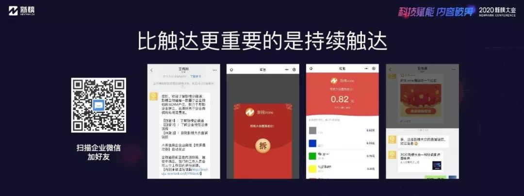 我們簡單展示幾個功能。這一頁展示的是企微通的紅包功能:用戶掃描企業微信活碼,添加企業員工的企業微信號,會收到提前設置好的歡迎語回復,以及一個新人紅包。企業通過一次拉新活動將用戶留存在自己的企業微信內,方便后續持續推送信息和商品,與用戶產生更多的交互。