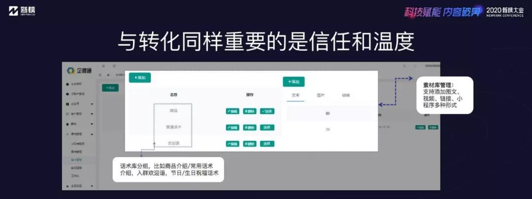 這一頁是企微通的話術庫和素材庫,話術庫涵蓋產品介紹、入群歡迎語、節日/生日祝福等,素材庫支持圖文、視頻、鏈接、小程序等多種形式,這些細節的標準化,都是為了通過專業服務加深與客戶的信任關系,體現企業的溫度。